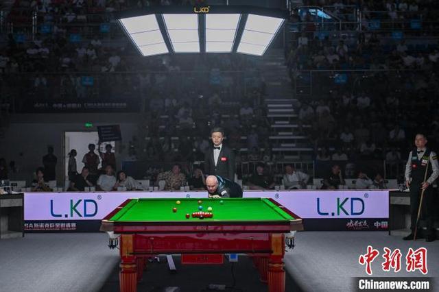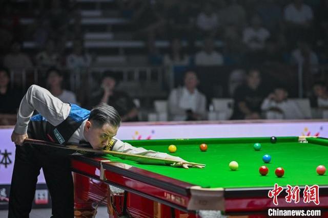 7月6日,中国·峨眉山CBSA斯诺克巨星邀请赛上,中国斯诺克选手肖国栋与老将约翰·希金斯展开巅峰对决,经过激烈角逐,肖国栋以5比2胜约翰·希金斯,精彩的球技为球迷们带来了一场高水平的斯诺克盛宴。图为比赛中老将约翰·希金斯使用架杆击球。中新社记者 刘忠俊 摄