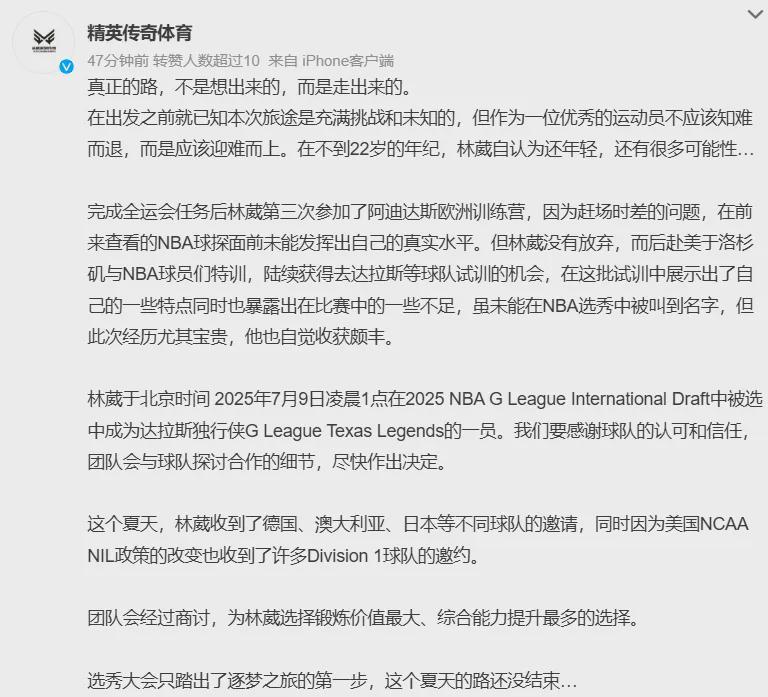今年NBA选秀大会开始前,林葳曾前往独行侠试训,表现一定程度上得到球队认可,这才有了如今在发展联盟达成合作。